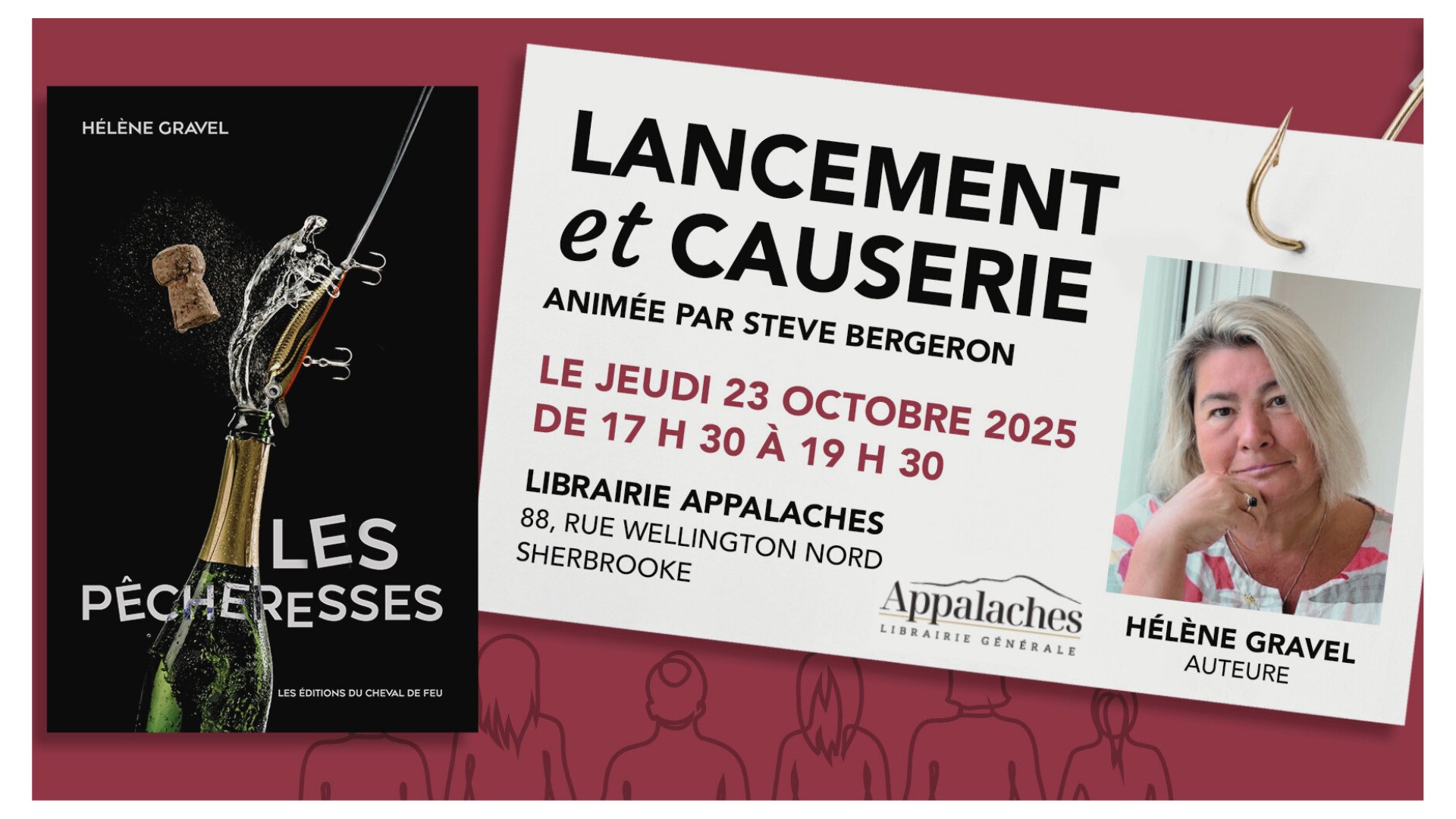 Mordez à cette invitation!Assistez au lancement du tout premier roman d’Hélène Gravel, Les Pêcheresses.Inspiré de faits réels, Les Pêcheresses est un vibrant hommage à la liberté retrouvée et à l'idée qu'il n'est est jamais trop tard pour réaliser ses rêves. Entre humour surprenant, émotions vives et complicité féminine, ce roman aborde l’amitié à l’aube de la soixantaine, les secondes chances et l’urgence de vivre.